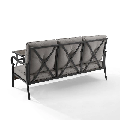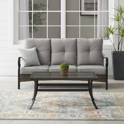 The Dahlia 2pc Sofa Set charms with traditional elements like curved arms and x-back seating. Constructed of powder-coated steel, the sofa offers deep cushioned seats covered in spun polyester, while the coffee table is topped with resin wicker covered in tempered glass. To complete the look, the sofa has a wicker accent along the base which complements the coffee table, making the Dahlia sofa set a unique addition to your patio or deck.