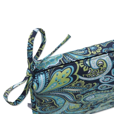 The gorgeous fashion and bright, coordinating hues of this set of two outdoor seat cushions bring elegance to any outdoor area. In the hot, on-trend paisley pattern, shimmering shades of aqua blue, navy blue, green and off-white create a cool style. Additional features of these outdoor seat cushions include square corners, 14″ ties and recycled polyester fill with zippered closures for easy removal. Also suitable for indoor use.