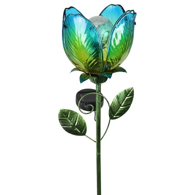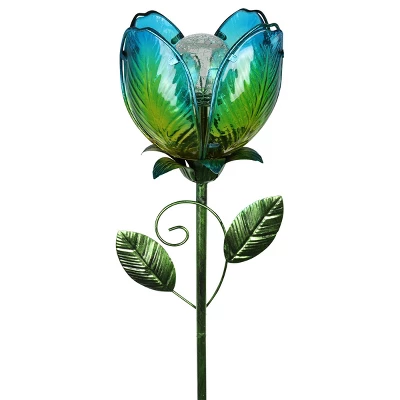 An illuminating blue solar glass flower stake adds a touch of romance to your garden! Beautifully designed, this flower has individual glass petals, hand painted metal leaves, and a solar glass crackle ball at its center that automatically glows at dusk. Grace your garden with warmth and charm all year long.