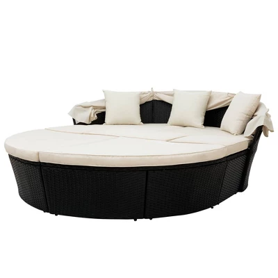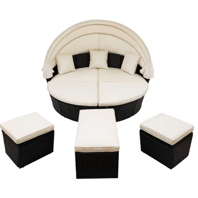 - 【WIDE RANGE OF APPLICATIONS】To satisfy your different demands, the seats are infinitely configurable, while the center piece can be freely used as a bench or a coffee table. The 2.36" thickened padded cushions and throw pillows double the comfort for you. Also, you can rearrange it into one smaller round daybed and three benches. Imaging with this daybed, you can enjoy a quiet afternoon alone when combining the seats, or enjoy chatting with family and friends when separating the seats.