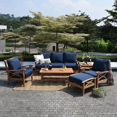 Pamper your feet with this comfy Chester teak patio ottoman from Cambridge Casual. This gorgeous outdoor ottoman is constructed of prime solid teak wood combined thick spun-polyester cushions in blue spruce, brige and nacy also combine with beautiful frame finishing. This versatile furniture can act as both ottoman or even extra seating for your guests. Even better, you can pair this ottoman with other pieces from Chester collection for complete outdoor seating ensemble you dream of.