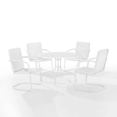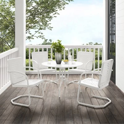 Nostalgia abounds with the Bates 5pc Dining Set. Four vintage styled chairs in vibrant colors surround a simple metal dining table for a fun and functional outdoor dining experience. Each chair features a square back with a unique basket weave design that allows air to circulate, adding to the comfort of the seat. With a cantilever base, the chairs offer just enough flex for relaxed al fresco dining.