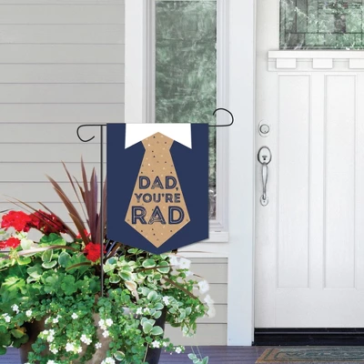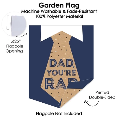 My Dad is Rad Garden Flag INCLUDES 1 polyester fabric material garden flag in a vertical pennant shape that measures 12 inches wide and 15.25 inches tall. (Flagpole Not Included) Cute Decor: Welcome houseguests with this weather resistant My Dad is Rad Garden Flag. Printed double-sided, We Love Dad – Father’s Day Party Garden Flag looks great placed close to your home, added to flowerpots, or displayed next to your favorite garden gnome decoration. Yard & Home: My Dad is Rad Garden Flag is machine washable and fade-resistant, allowing you to easily display in your outdoor lawn or inside your home for a fun Father’s Day Party decoration. The small and cute size helps make this a great housewarming gift for a loved one’s deck, patio, porch, or yard. High-Quality Supply: My Dad is Rad Garden Flag is professionally printed double-sided on 100% polyester material. With a 1.625-inch flagpole opening, easily & quickly display the vibrant We Love Dad Garden Flag. Please Note: Flagpole Not Included – will fit most standard-sized garden flag stand flagpoles. Printed In The USA: My Dad is Rad outdoor lawn and home Garden Flag is designed and manufactured at our Wisconsin facility using materials that are Printed in the USA – Fabric Flag Made in China.