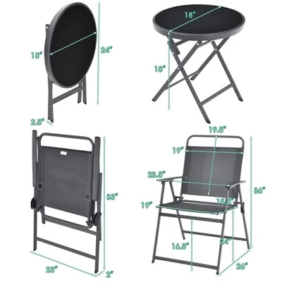 - No Need to Install: This 3-piece folding bistro set is not required for assembly so that you can use it immediately, greatly saving your time and energy. Size of unfolding table: 18” x 18” (Dia. x H), dimension of folding table: 18” x 2.5” x 24” (L x W x H), dimension of each unfolding chair: 26” x 23” x 36” (L x W x H), dimension of each folding chair: 2” x 23” x 33” (L x W x H), weight capacity of table: 66 lbs, weight capacity of each chair: 270 lbs.
