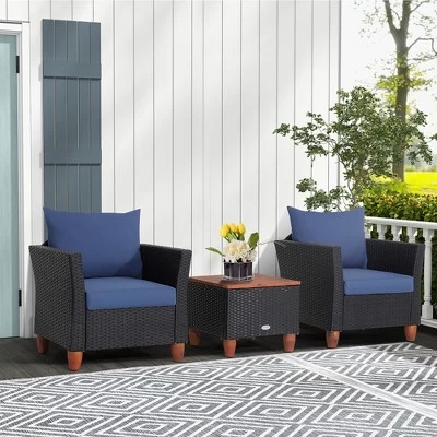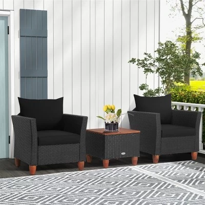 - WHERE DOES THE LEISURE TIME BEGIN? Your outdoor leisure time will start with this 3-piece outdoor conversation set. It includes 1 coffee table and 2 ergonomic armchairs, which create a cozy for you and your beloved one. And it is perfect for limited places, such as porch, patio, garden and poolside, etc.