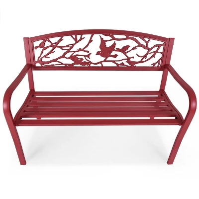 Our red cast iron garden bench will be a great additional to your garden or other outdoor living space for its bright color and modern design. It is a great place to sit and rest on while enjoying the outdoors. Made of steel slats , this bench is sturdy yet comfortable enough to relax on in the sun and durable for long life span. The seat is composed of 6 steel slats to provide support. This bench is a perfect gift to those who want to relax in the garden! Do not hesitate to buy one!
