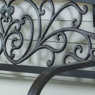 With a black finish, this scroll bench is an elegant addition to any garden. The scrollwork bench has a slatted seat, curved arms, and arched back. Crafted from durable cast-iron and steel, the bench is outdoor safe and rust-resistant.