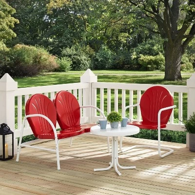 Relax and unwind on the nostalgically inspired Griffith 3pc Conversation Set. Designed to withstand the hottest summer days, this seating set’s steel construction and powder-coated finish resist rust and sun fade. Featuring a vintage look that comes in a variety of vibrant colors, the loveseat and chair add a splash of retro fun to your porch or patio. Add in the convenience of the pedestal side table and the Griffith conversation set will have you entertaining outdoors in style.