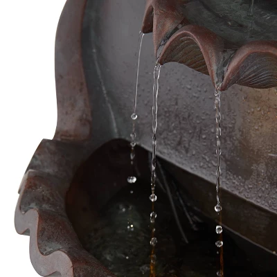 This lighted tiered wall fountain featuring a lion’s head is made of lightweight cast resin and features a bronze finish. Water cascades from the lion’s mouth into a scalloped basin below, which houses an light that illuminates the water as it flows from one tier to another. This traditionally detailed fountain may be used both indoors and outdoors.