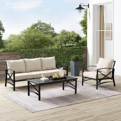 Entertain in classic style with the Kaplan 3pc Outdoor Sofa Set. Comprised of a sofa, chair, and coffee table, this set features sturdy steel construction with a transitional x-back design. Both the sofa and chair have comfortable seat and back cushions covered with solution-dyed polyester, while the coffee table showcases a classic slatted look. Bring family and friends together for outdoor relaxation with the Kaplan 3pc Outdoor Sofa Set.