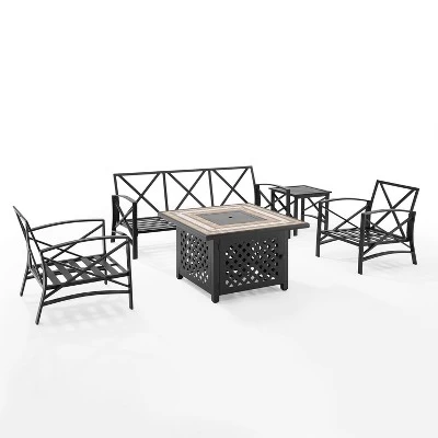 Enjoy an evening around the fire with the Kaplan 5pc Outdoor Sofa Set. A sofa, side table, and two chairs surround the propane-powered fire table. Made from sturdy steel, the outdoor seating and side table feature a transitional design. Both the sofa and chairs have comfortable seat and back cushions covered with solution-dyed polyester. The fire table has a tiled stone top that sits on a steel lattice base, which houses both the propane tank and the gas controls. Bring family and friends together for outdoor relaxation with the Kaplan 5pc Outdoor Sofa Set.