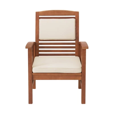 Add style and comfort to your outdoor living space with this set of two attractive eucalyptus wood outdoor chairs with cushions and coordinating cocktail table. Frame is made from durable eucalyptus wood that will stand up to varying weather conditions. The set of two chairs include coordinating back and seat cushions that provide luxurious comfort all day long. The neutral wood finish and cream colored cushions will easily match with any accent pieces in your outdoor space, or pair these beautiful chairs and table with other items in the collection for the perfect outdoor entertainment space!