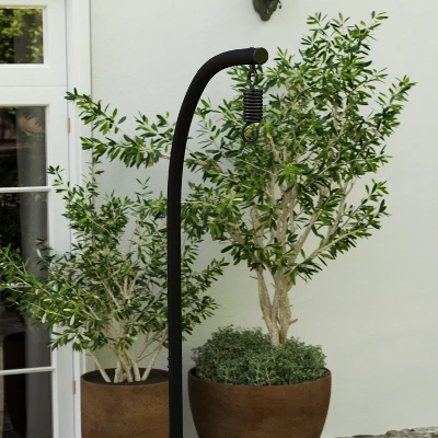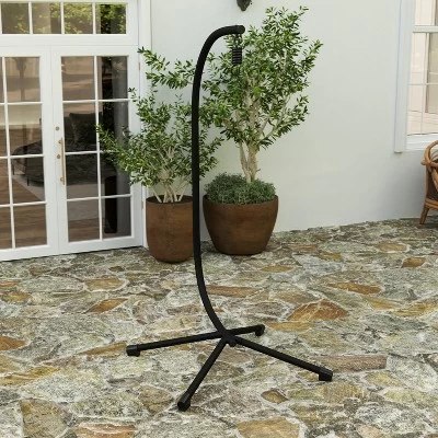 Create an upscale lounge area indoors or outdoors with this all-weather C-stand ideal for your favorite hanging chairs from egg chairs to kids sensory swings. Durably constructed from powder coated galvanized steel and boasting a wide, X-shaped base, this hanging chair stand supports up to 300 lbs. static weight and allows 360° rotation for easy conversation. Assembly takes less than 30 minutes and cleanup is easy with a damp cloth so you can relax sooner, rather than later.