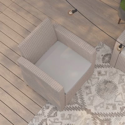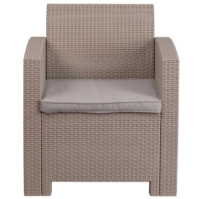 Well composed with modern materials and classic design, this patio chair is ideal for relaxed settings in the 21st century. The contemporary faux rattan resin frame is complimented by a traditional wicker pattern, giving this chair a vintage look with present day functionality. Crafted for all-weather use 365 days a year, the cushion cover are removable for convenient cleaning so you can keep your chill space looking cool. This outdoor chair is chic enough for the indoors, or wherever you want to establish an easy going vibe.