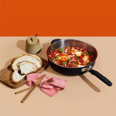 - GORGEOUS BROWNING, BIGGER FLAVORS: Psst: browning and caramelization are the secrets to flavor development. The trick? Consistent high heat. With a super-thick aluminum-core base design, this saute pan gets ripping hot and spreads heat evenly across the surface — and it stays just as hot as your food hits the pan! That’s how you get those lovely golden brown crusts.