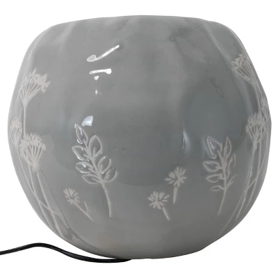 The Wildflower Fountain features a neutral gray glossy glaze with delicate botanical shapes revealing raw white clay underneath. Simple in shape, this orb fountain opens up at the top where the tranquil water bubbles over small pebbles. Refined, textural, and neutral, this is a great transitional fountain to add a little natural charm wherever it finds a home.