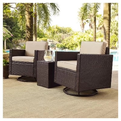 - Includes a patio side table and 2 swivel-rocking wicker chairs for superior seating comfort