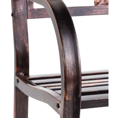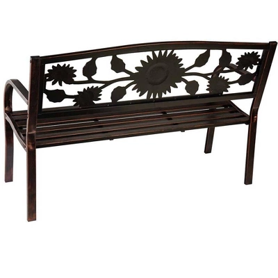This cheerful Sunflower Metal Garden Bench checks all the boxes: the detailed sunflower design makes the bench a work of art as well as high-quality outdoor seating. This bench is a great value for outdoor furniture. Generously sized and perfect for two, it’s the perfect spot to relax and enjoy your garden, a nice view or a good book. This decorative garden furniture features a beautifully detailed back with sunflowers, stems and leaves. The classic design lends a timeless look to any setting. A must-have for your home and garden! Sturdy steel frame is painted black; cast iron back design features a brushed copper finish. A slatted seat and rounded arms add to the timeless appeal. All-weather powder coat. Easy assembly.