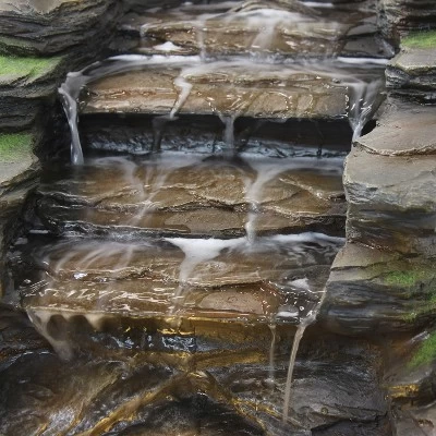 Add a touch of nature-inspired beauty to your patio, balcony, or garden with this outdoor water fountain with LED lights for subtle and sweet illumination at night. This realistic fountain mimics the appearance of natural shale rock formations but is made from lightweight yet durable polyresin, so it is easy to move and maintain. This fountain is also durable against the elements outdoors for long-lasting use year after year. This fountain features 5 tiers and creates a relaxing sound as the water cascades from tier to tier in eye-catching waterfalls, before collecting in the bottom basin and circulating again. The water recirculates throughout the fountain thanks to the adjustable flow electric submersible pump. Setting up the fountain is simple with no plumbing installation required. Plus, this fountain is illuminated by warm white LED bulbs, so its beauty is visible even after the sun sets for relaxing evenings and nights.