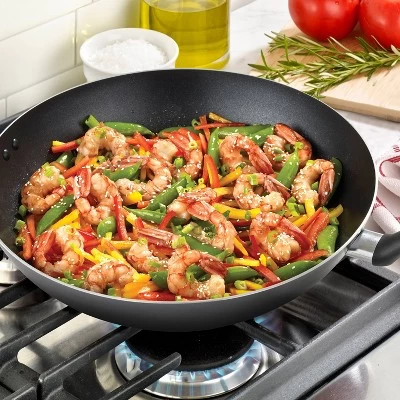 Deep fry, roast or stir meat, fish and vegetables with this multipurpose T-fal jumbo wok. This 14″ cooking pan has a wide base and high, sloped edges for no-spills tossing. Nonstick coating allows for low-fat cooking and easy cleaning. This wok is made of heavy- duty aluminum for even heat distribution. The long and curved handle offers perfect grip while stir-frying your favorite ingredients and the small helper handle offers extra grip when lifting. Both handles stay cool to the touch. This T-fal nonstick pan can be used on gas and electric coil cooktops. Resists scratches. Dishwasher safe.