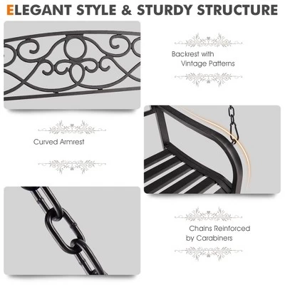 Create a beautiful sitting area to enjoy the beautiful weather with your beloved ones by relaxing on this porch swing bench! Made of high quality metal frame with powder-coated surface, this hanging swing porch is rustproof and durable enough to stand the test of time. Plus, 2 sturdy hanging chains are evenly stressed and hold the entire bench firmly. With ergonomic backrest and armrests, the hanging swing allows you to sit comfortably while relaxing on it. The unique patterns and stylish appearance make the swing bench suitable for backyard, porch, deck, garden and so on.