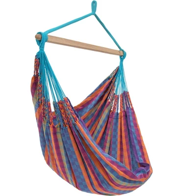 Vivere’s Latin hammock chair collection is constructed of tightly woven cotton, a strong and durable wood spreader bar, and a cotton rope hanging sling. The ultra wide seat is the ideal spot to hide for an afternoon nap, or to sit up and enjoy the activities happening around you. Choose one of the eye catching color options to elevate the aesthetic of any backyard space. Hanging hooks and springs sold separately.